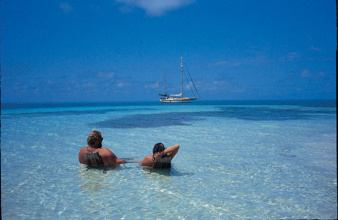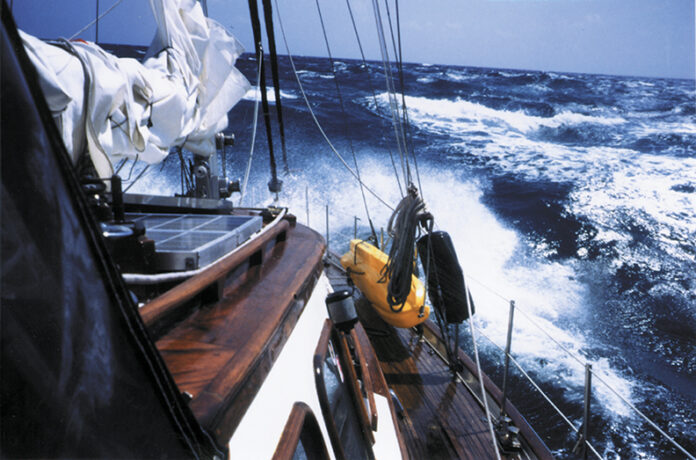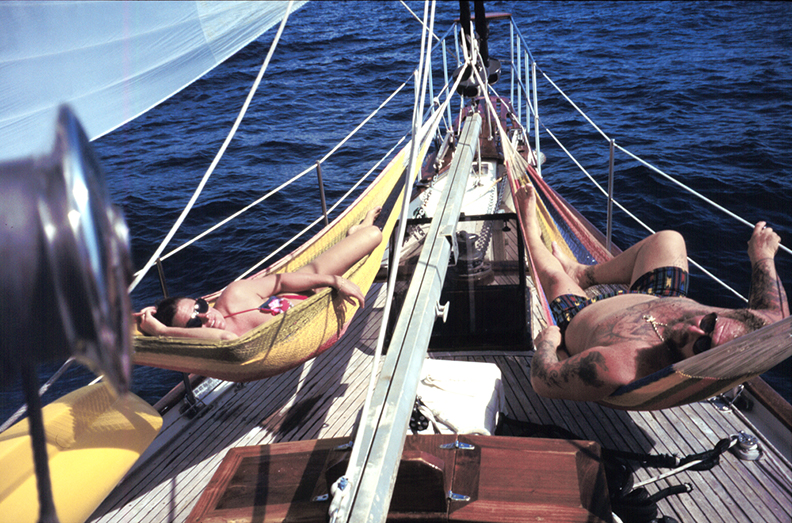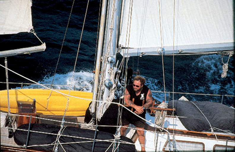 We were sailing on a broad reach, doing about eight knots with 12 knots of wind coming over our port stem. The seas were as calm as a lake, and there were flying fish everywhere. We were about 20 miles off Cabo San Lucas. We’d left at 5 a.m., and the crew had all gone back to sleep. John and Andy had a rough night trying for one last romance before setting sail.