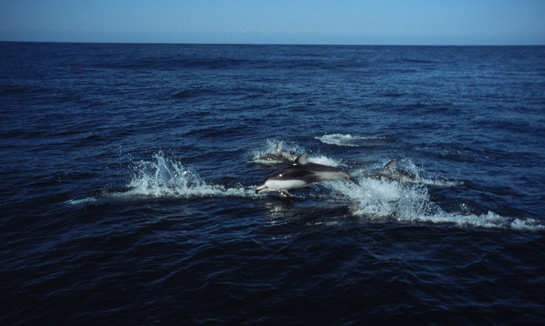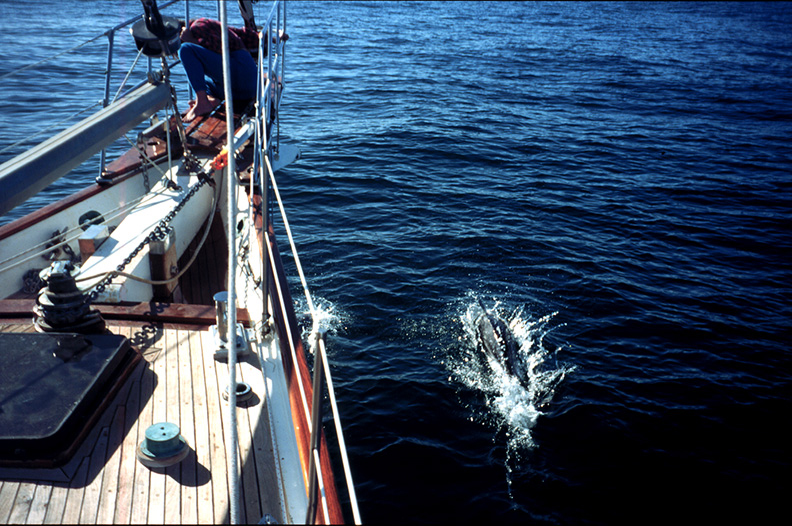 But it was a night to remember. Just after a great dinner of roast beef and asparagus with hollandaise sauce we came up on deck and found the boat surrounded by hundreds of dolphins. The water had a fluorescence I hadn’t seen since off the coast of Guatemala some 18 years ago while sailing on the old STONE WITCH, and wherever the dolphins dove they left a sparkling trail. It was just like a light show, and I felt like I was having a flashback from the sixties or something. Bright lights under the sea surrounded us for hours as the dolphins played in the black sea with brilliant green flashes and trails.
