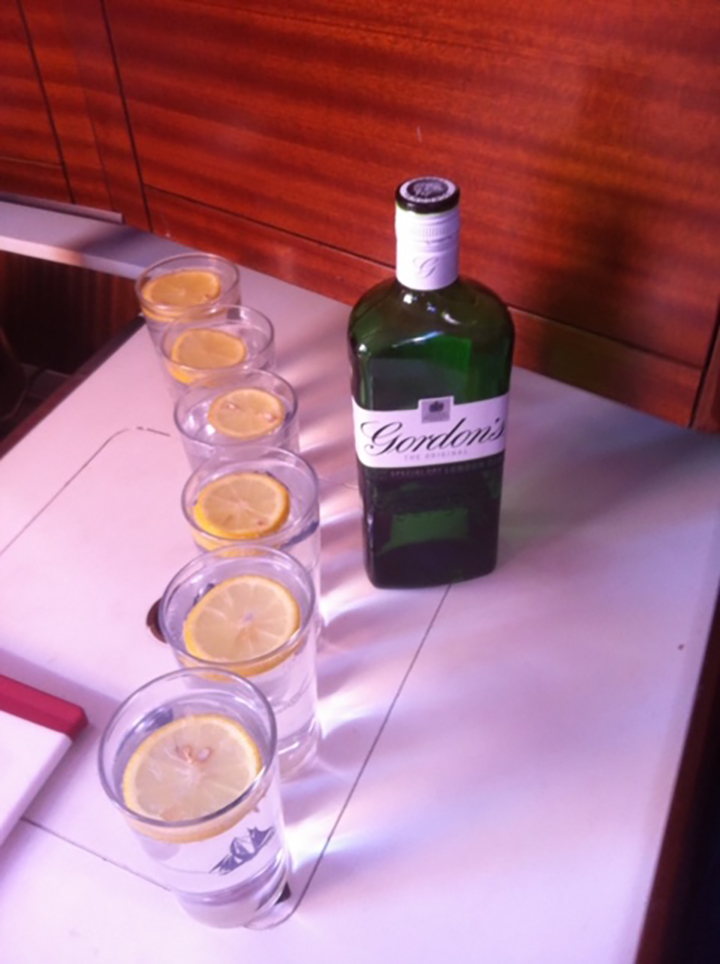 CJ who’d managed to stay reasonably dry as navigator. Yelled from below “perhaps a Gin & Tonic would solve any of you woos”. We all trooped down completely sodden having stowed up. Collectively each of us took a big sip of CJ’s drink; slowly realising that it hit quite well. With a one litre bottle of gin with just six tots; Mr. Gardiner had used almost the whole damn bottle! We all tend to doubt whether any other G & T’s have ever gone down better…