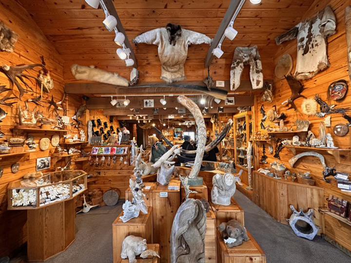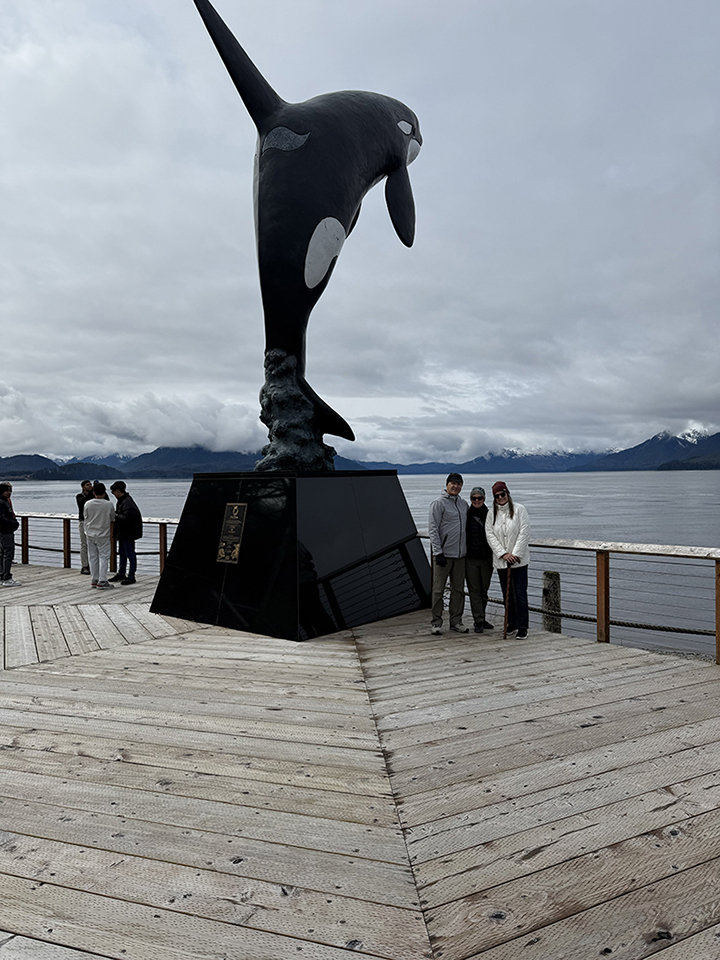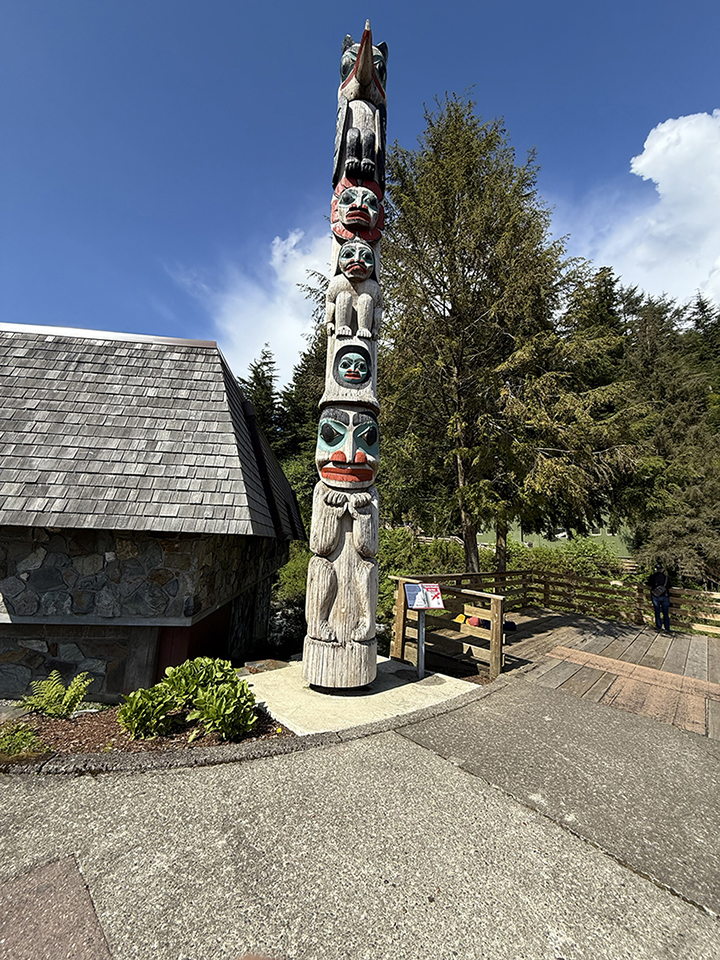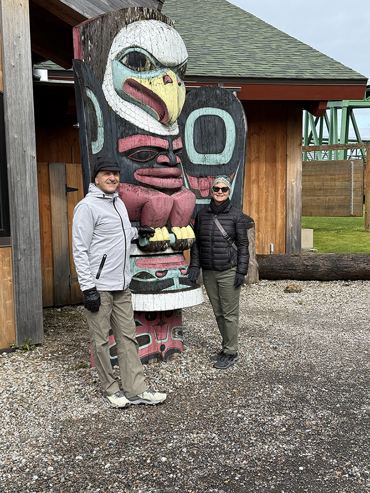 Hoonah, our next stop, was an interesting place and quickly became one of my favorites. It’s located at an old salmon canning station. The four of us got off the ship and were delighted to discover we didn’t have to walk—a chair lift carried us through the forest to the main attractions. The local native population formed a partnership, purchased the land, and built a theater with live performances, several food and drink venues, and shops inside the old canning factory. They even offer a chair lift ride up the mountain with a zip line down. We chose not to strap in for that wild ride, but we did find great shops filled with native artwork. There was also a tiny donut shop, no bigger than 8×10, selling micro donuts by the dozen. We downed four dozen in minutes!