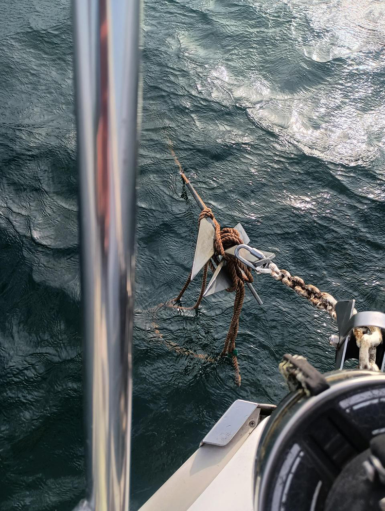 Dennis Berke and his wife have been sailing their Hunter 290, BlueBelle, out of Port Superior Marina in Bayfield, WI since 2002. On Summer Sailstice they sailed to Stockton Island, one of the 22 islands in the Apostle Islands National Lakeshore in Lake Superior, located off the coast of Northern Wisconsin. They were quite shocked to pull up a nautical rat’s nest when they weighed anchor after holding fast during high winds and captured this great shot.