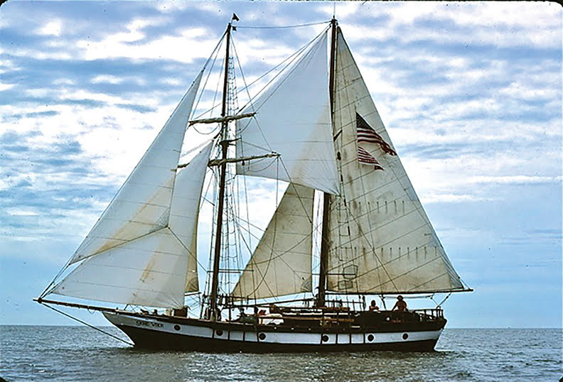 As we approached the beach we were under main and headsail only. When we were about 200 yards off Alan had us drop the main. We were doing about 2 knots. We had a couple of sweeps out just in case, but as it turned out, we never needed them. We then dropped the headsail. When we were about 100 feet off the beach he hollered to drop 150 feet of chain and he pushed the tiller hard a-port. The boat rounded up like a trained seal and when we came to rest, the stern was about 10 feet off the beach. “Toss the stern hook,” he ordered, and a small (about 35 lb. Danforth) with 10 feet of chain and about 100 feet of 3/4” line was heaved over the stern. One of the crew jumped into the dinghy and took it ashore, dragging the anchor about 30 feet up the beach, and pushed it into the soft white sand.